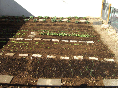 In just a short 20 days, we have a pretty good showing. Everything has sprouted (except the garlic, which requires more time and more cold weather), and the young broccoli and cauliflower plants are looking good. |