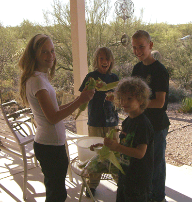 June 2008 - They love to help Grandma shuck the corn, but especially to eat it!