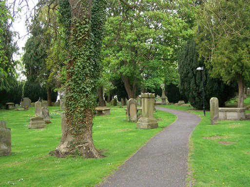 Graveyard across from the Abbey; note "castle" head stone